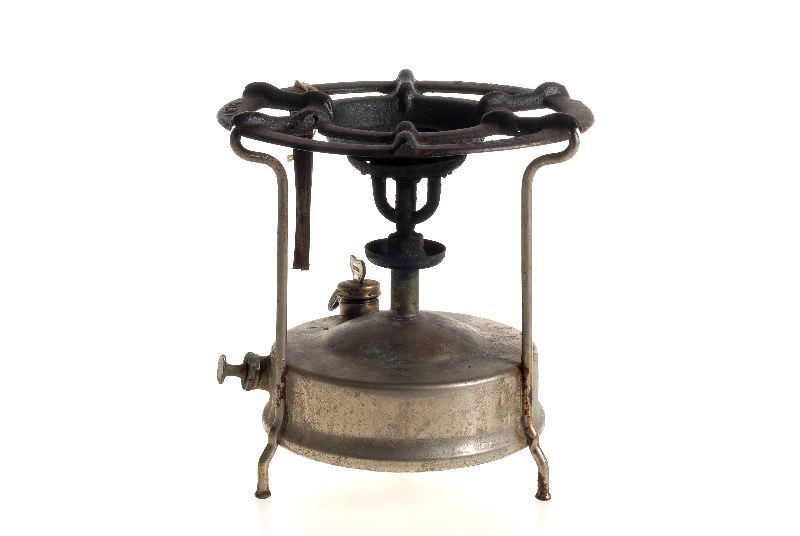 Med fotogenbehållare av förnicklad mässing och grytring av pressad stålplåt märkt "PRIMUS". Brännarens ytterkåpa saknas.