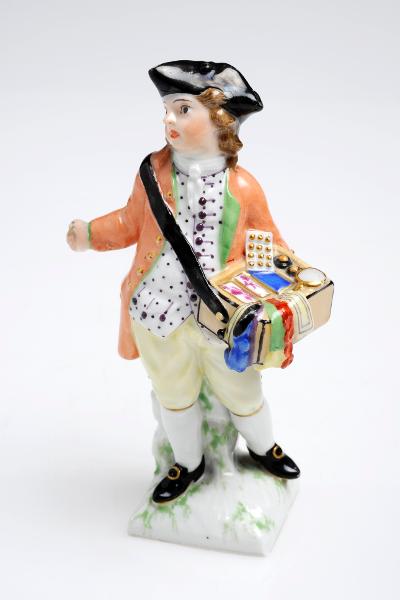 "Pojke som kramhandlare, porslinsfigurin ur en serie barnbilder efter modell av Wilhelm Christian Meyer i Berlin, 1769. Höjd 11,3 cm.