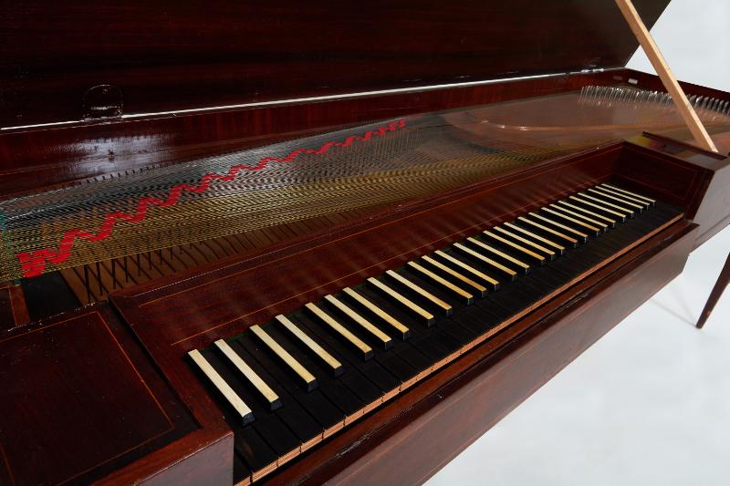 Klavikord, trä, mahgonyfanerad underdel, locket i mahognyimitation; kraftigt ombyggt, låset saknas; etikett: Pehr Lindström & Söderström Stockholm 1804.