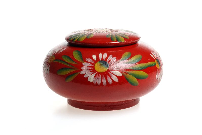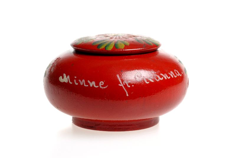 Rund, rödmålad, invändigt trävit med starkt bukig sida, dekorerad med blommor och blad i vitt, grönt och gult. Löstagbart lock, text på dosans sida: Minne från Gränna.