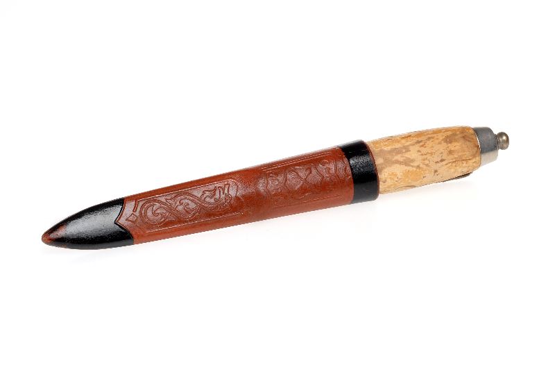 Med slida. Stål, trä, masurbjörk, läder, metall. Två Mora-dolkar med knivblad av stål, anslutna till resp. skaft medelst metallmitra och med skaften avslutande med en metallhylsa med rund ändknopp: Instuckna i knivslidor av läder: a.) brunmelerat skaft av masurbjörk; texten "K.S. ERIKSSON MORA" på knivbladet, mörkbrun läderslida med vapen under krona och stiliserad dekoration samt försedd med bältestropp; b:) Ljust träskaft; texten: MOARA [inramad] på knivbladet; ljusbrun och svart läderslida med vapen och texten: "CA MORA" samt drakslinga.