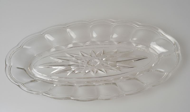 Ovalt. Det flackt vågformade brättet är indelat i sexton sektioner. Pressat stjärnmönster [imiterande skärslipning] i spegeln.