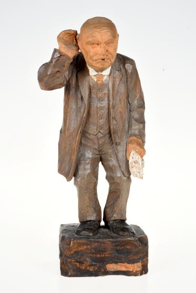 Träskulptur av Georg Hallgren. Helfigur i miniatyr avbildande källarmästare Göthe. Skuren i ett stycke. Stående på kvadratisk sockel, med högra handen vid örat och en vit serviett i vänster hand, iklädd grå kostym med väst samt vit skjorta och röd slips. Signerad på sockeln "G.H. 1916". samt undertill "Georg Hallgren 1916".