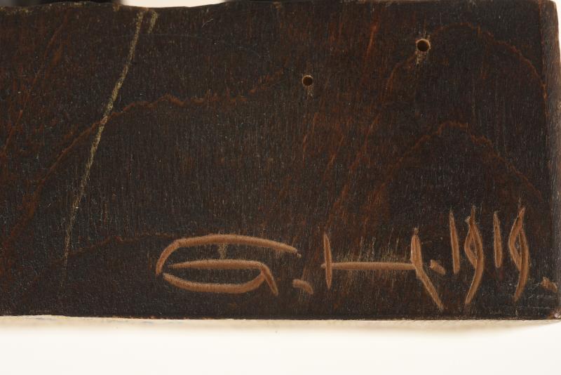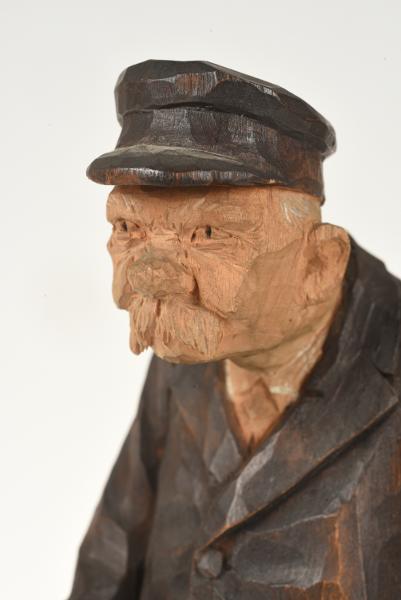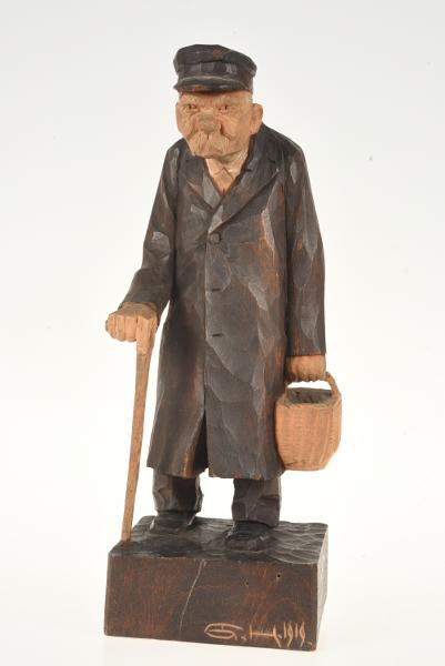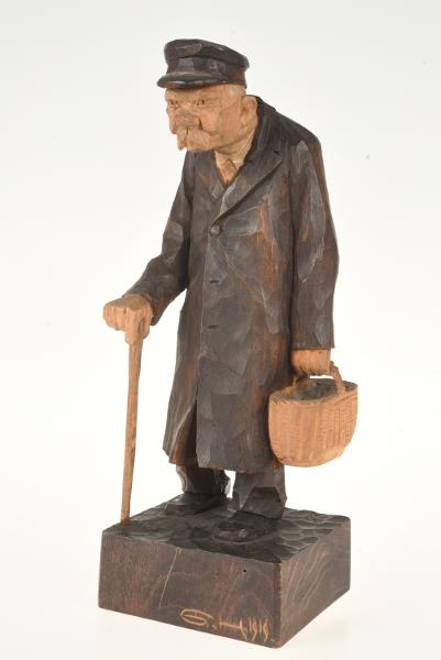Träskulptur av Georg Hallgren. Helfigur i miniatyr sammanhörande med föregående (KM 75582), avbildande P. Nilsson, "Rögaren". Skuren i ett stycke. Äldre man med käpp och korg iklädd en lång, svart rock och skärmmössa. Signerad på sockeln "G.H. 1919".