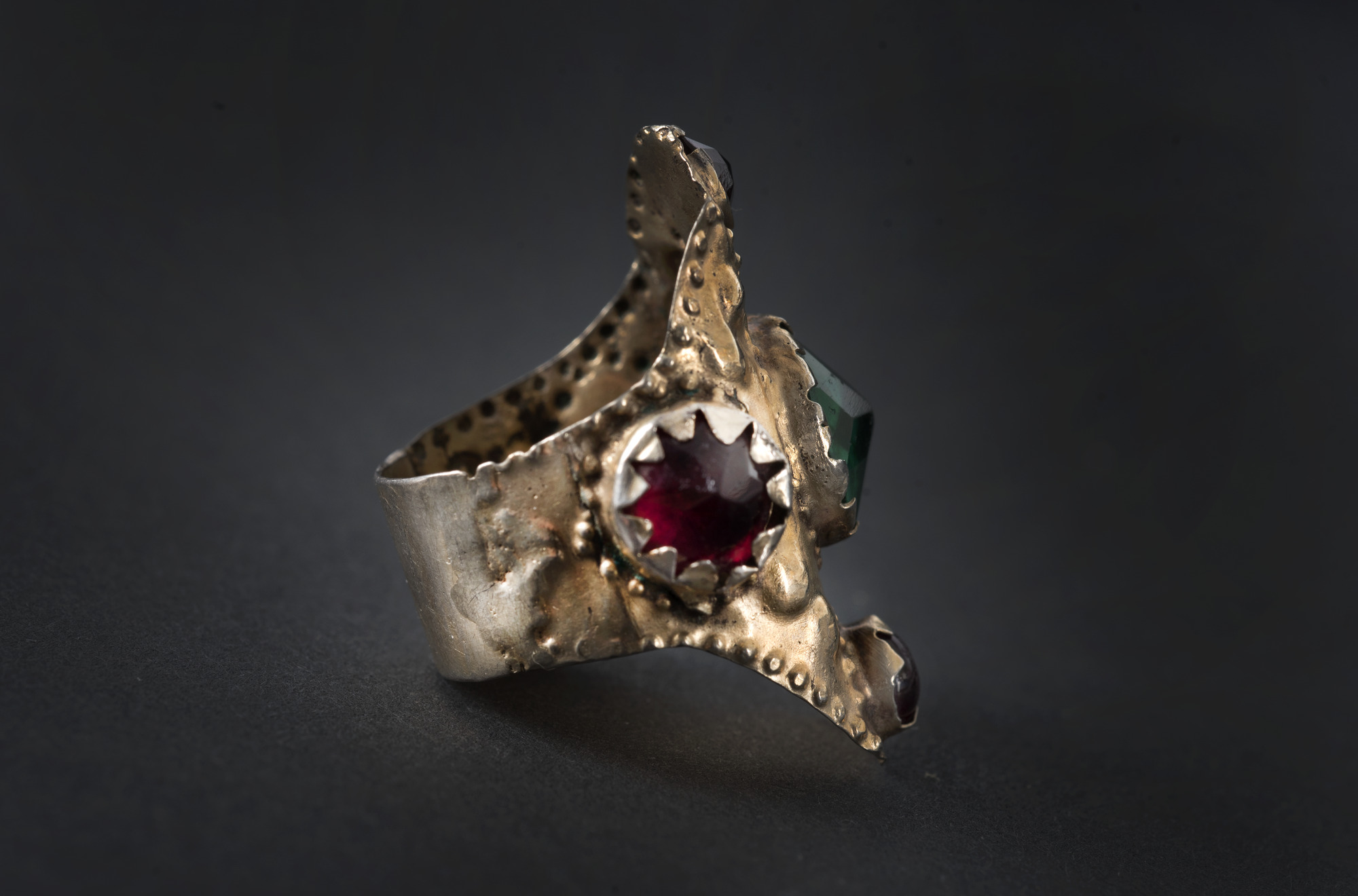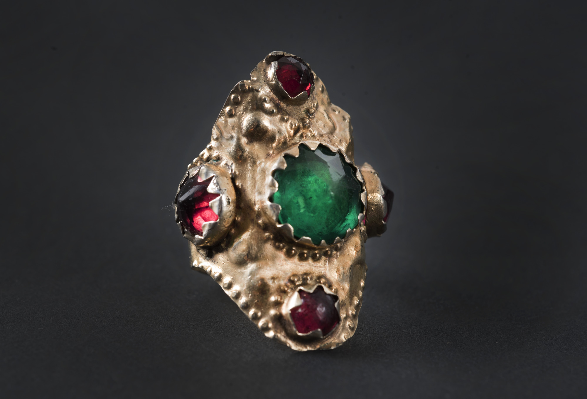 Bred ring som övergår i en romboid platta med en stor grön mittsten och fyra mindre röda stenar = glasfluss. [Avritad stämpel].