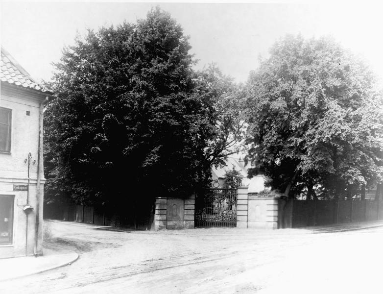 - Petriplatsen i hörnet av Bredgatan och Sankt Petri Kyrkogata, år 1922. Efter en utställning på området, samma år togs staket och grindar bort. Grindarna fanns ursprungligen i Lundagård och finns numera på Kulturen.