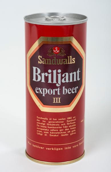 Ölburk; aluminium; cylindrisk burk med avfasade kanter 45 cl; röd botten, text i guld och vitt på vinröd botten: Sandwalls Briljant export beer III ; h 15,5 cm; diam 6,5 cm; formgivare Rune Ohlin; tillverkningsperiod 1970-1990 av PLM, Malmö. Givaren arbetade som tecknare och grafisk formgivare hos Åkerlund & Rausing ca 1955-1960 och på PLM från 1960 fram till sin pensionering 1999. Han har under åren samlat exempel från PLM:s verksamhet i form av original, provtryck, förlagor, oanvända förpackningar mm. Han har även samlat exempel på kollegors formgivning. Han fick bland annat utbildning på ÅR:s atelje där han började på 1950-talet. Han har även arbetat och ställt ut som konstnär, se uppgiftsboken.