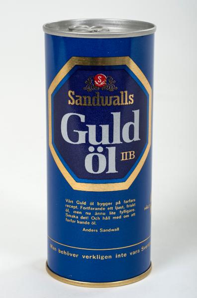 Ölburk; aluminium; cylindrisk burk med avfasade kanter 45 cl; blå botten, text i guld och vitt på blå botten med guldram: Sandwalls Guldöl IIB ; h 15,5 cm; diam 6,5 cm; formgivare Rune Ohlin; tillverkningsperiod 1970-1990 av PLM, Malmö. Givaren arbetade som tecknare och grafisk formgivare hos Åkerlund & Rausing ca 1955-1960 och på PLM från 1960 fram till sin pensionering 1999. Han har under åren samlat exempel från PLM:s verksamhet i form av original, provtryck, förlagor, oanvända förpackningar mm. Han har även samlat exempel på kollegors formgivning. Han fick bland annat utbildning på ÅR:s atelje där han började på 1950-talet. Han har även arbetat och ställt ut som konstnär, se uppgiftsboken.
