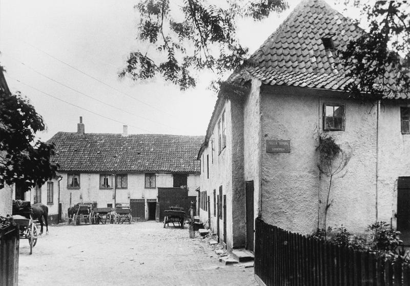 Lund. Repro av neg överlämnade av byggnadsnämnden. G:a neg nr. 83. Gårdsinteriör från kvarteret Sankt Peter, på skylten; Maria Nyman sömerska. Repro från L 2217.