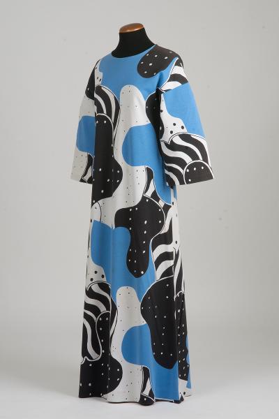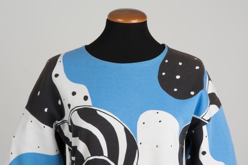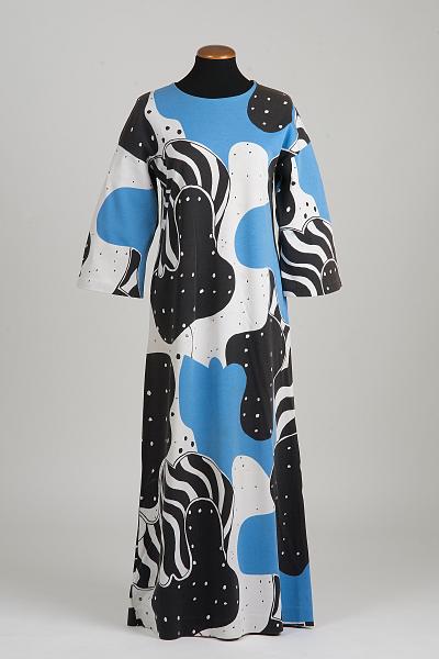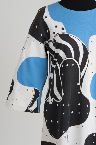 Lång. 3 te-jersey, trikå. Filmtryck, mellanblått-svart, vit botten (typiskt rörligt, stortvindlande mönster). 3/4 lång, vid ärm, utställd kjol.