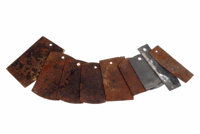 Huvudsakligen mallar till luskammar. Rektangulära med rundade kortsidor. Hål för upphängning. Rostiga.
