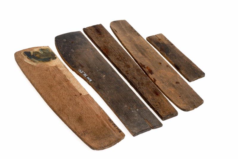 Avlånga med rundad översida. Två stycken av cederträ den ena med rest av mönstrat papper. Naturfärgad.