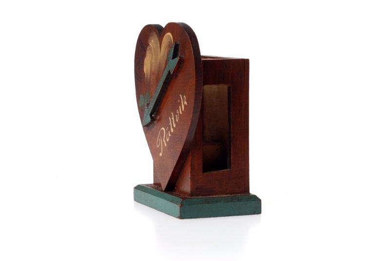 Behållaren har en rektangulär form och är öppen upptill där tändsticksasken ska stickas ned. På sidorna är rektangulära öppningar för svavelspånen. Behållaren står på en rektangulär grönmålad sockel. En platta i form av ett hjärta är fastlimmad på framsidan av behållaren. Inuti behållaren finns en 2 x 2 cm stor trästock. Behållaren består av fastlimmade skivor. Hjärtat är dekorerat med en pålimmad grönmålad pil samt påmålad dekoration i gult, grönt och svart. Rättvik är målat med gult.