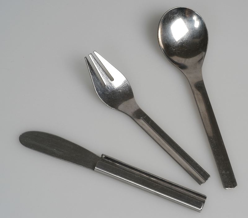 Tredelat bestick med sked, gaffel och kniv. Knivskaftet en hylsa där gaffelns och skedens skaft kan skjutas in så att bestickets tre delar sitter fästa ihop. Platt, brett knivblad, format som smörkniv. Gaffelns blad äggformat, avsmalnande ut mot tänderna. Stort runt skedblad.