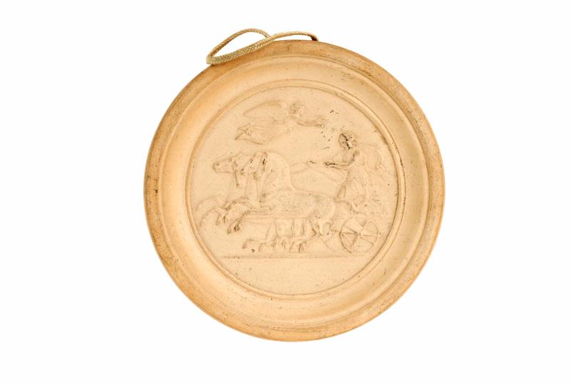 Rund keramiktavla med hästar och man i en vagn. Över hästarna och mannen en ängel.