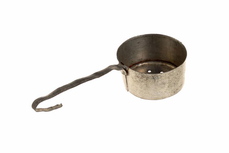 Kastrull för ångkokning, 8 hål i botten och långt handtag. Silverfärgad.
