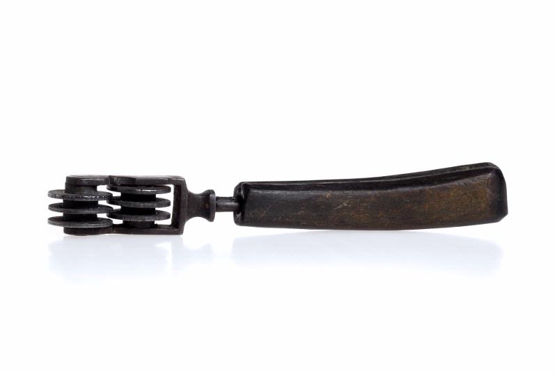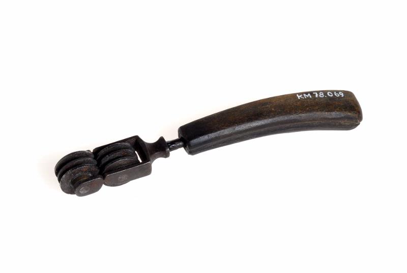 I främre delen 6 st trissor, som går delvis omlott, varemellan knivseggen skall dragas. Stålet fäst i svart hornskaft, något böjt och med nästan rektangulär profil.