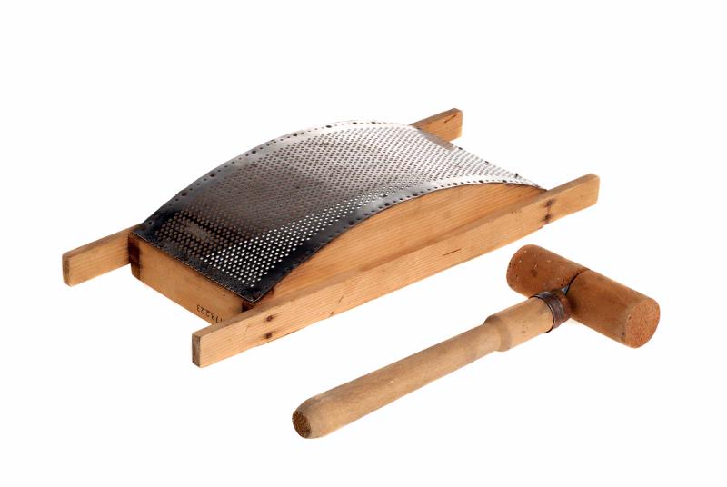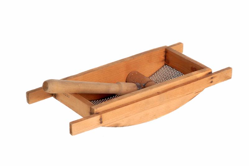 Passerapparat, trä, stål sk. passervagga. Två delar, tråg i form av vagga L: 39 cm. Br: 16 cm. samt cylinderformad rulle med handlag L: 27,5 cm. Br: 11,2 cm.