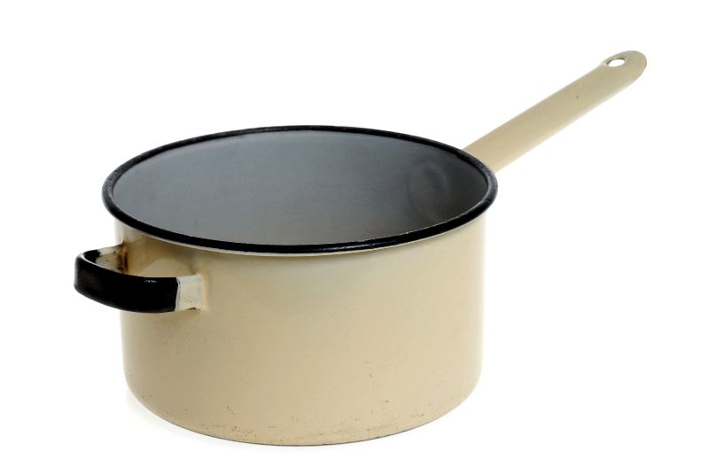 Kastrull, emaljerad järn, plåt, rund, rak med en våghänkel och ett långt, rakt handtag på var sin sida kastrullen. Lock saknas. Gulbeige med svarta kanter.