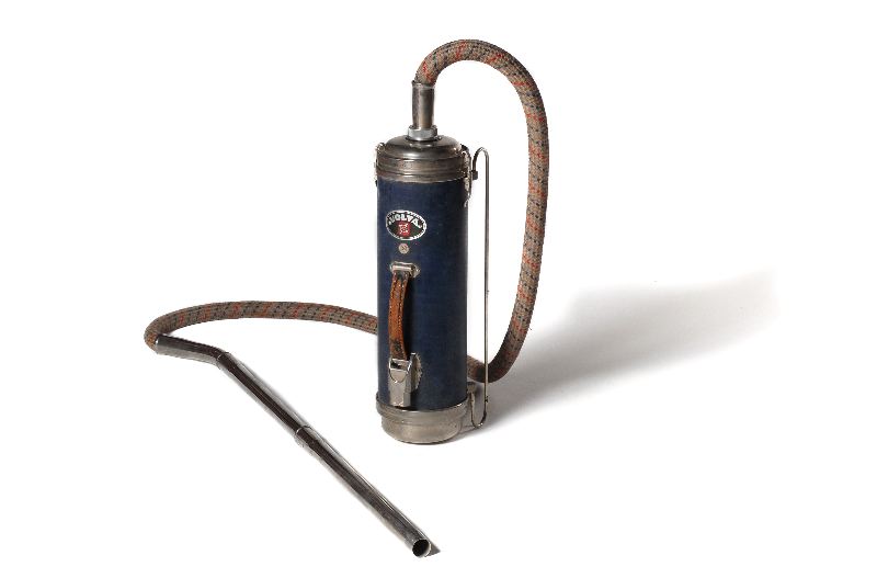 Cyindrisk dammsugare på två konade stålmedar klädd med blått galonmaterial i ödleimitation. På ovansidan läderhandtag samt uttag för sladd som är ca 4,5 m lång. Slangen, drygt 2 m lång, i grå väv med röda och blå inslag. Tillbehör: förlängningsrör, munstycken för möbler (2 st), mattor (1 st), element (1 st) samt 1 runt för malmedel, som också finns i oöppnad förpackning (avsedd för utblåsning) samt 9 st dammpåsar i beige crépepapper.