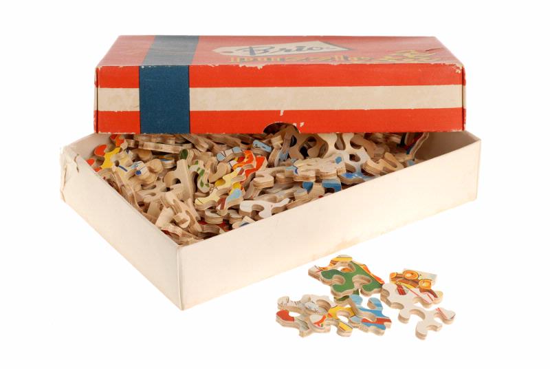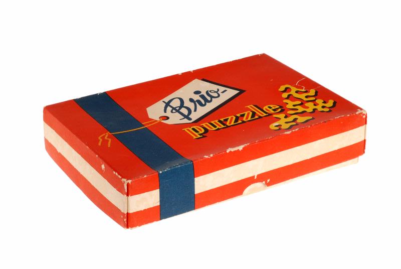 Kartong med rött lock, blå och vita ränder och tre gula pusselbitar. Text "Brio-puzzle". Etikett på kartongens undersida X981. Motiv: Tomten åker släde. Ca 200 bitar. Kontr.No...
