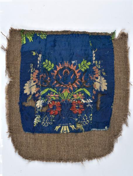 Sidenbrokad, polykrom blombukett på blå botten. Uppsydd på ljusbrun vadmal. Upptill rester av ljusgrönt sidenband. Se avritad bild på katalogkortet.