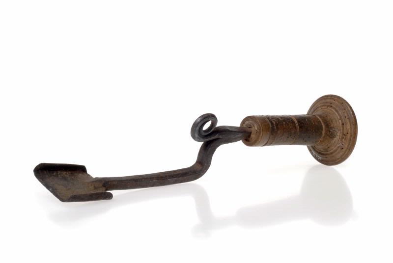 Handtag i svarvat trä, uppåt vidgande med platt, rund "knopp". Mot järnet en ring av horn. Järnet med ett 5 cm brett blad fösett med kanter på långsidorna. En rullad järnten utgör stopp mot bladet.
