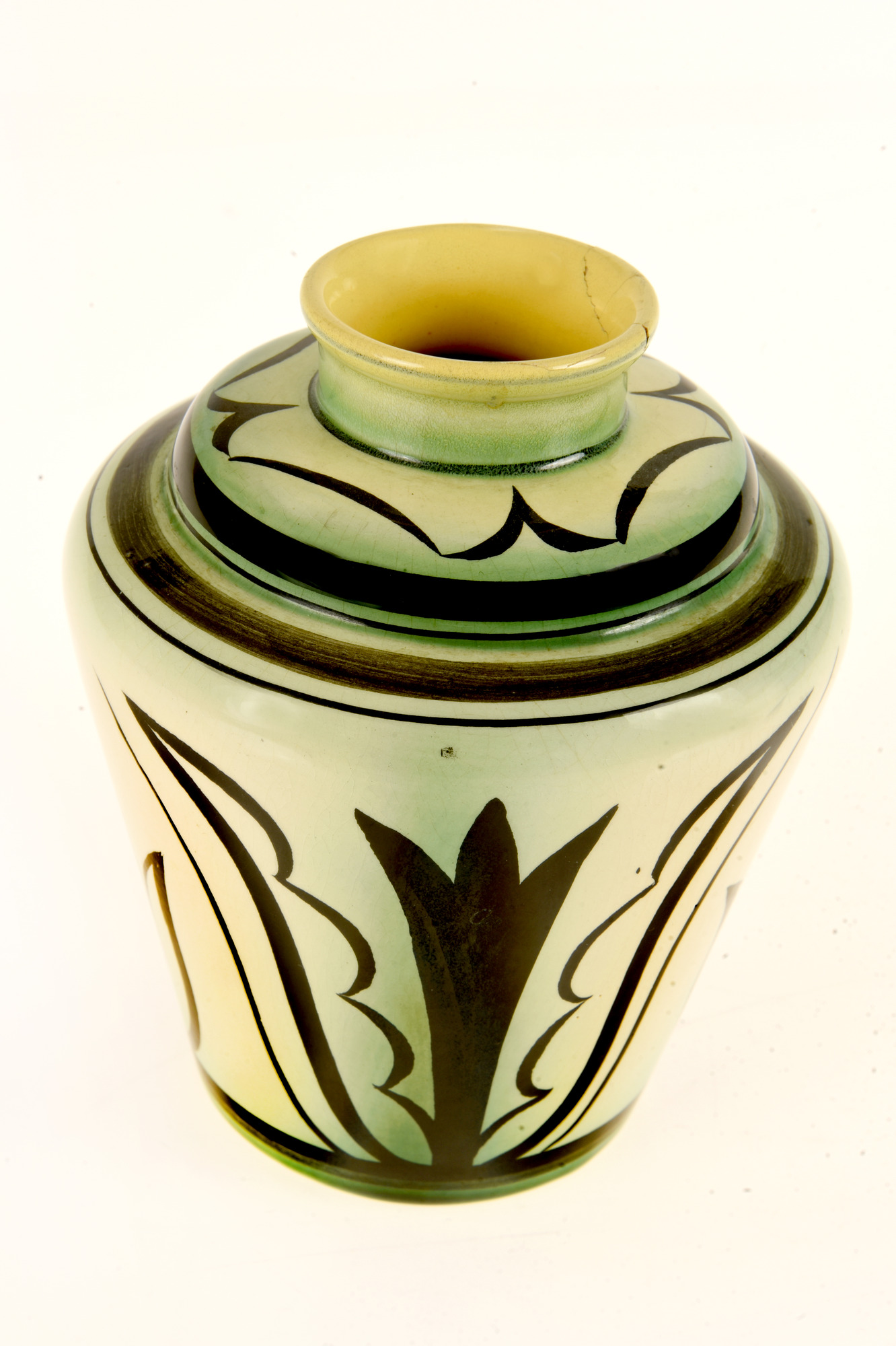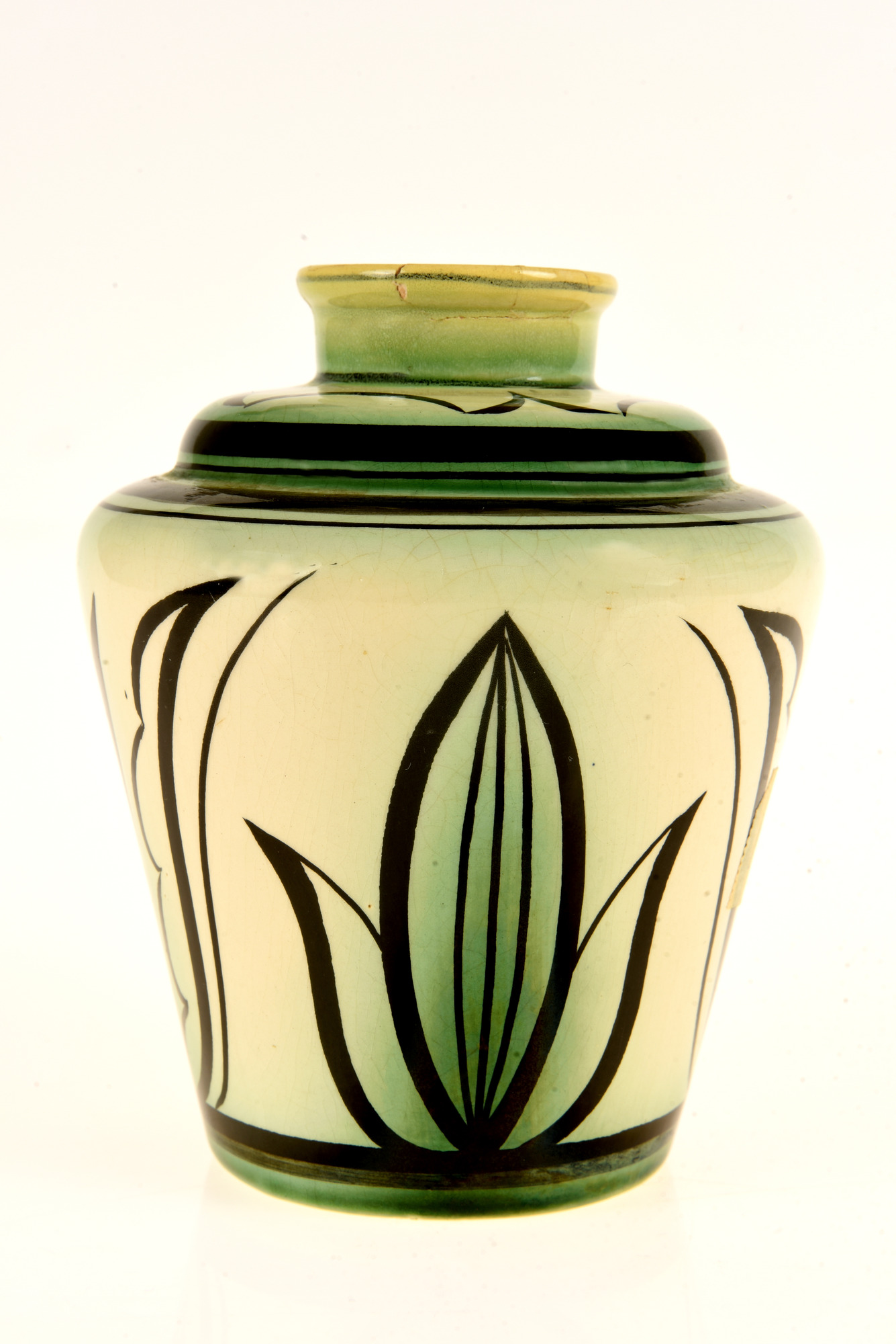 Rund. Raka, uppåt vidgande väggar. Skulderparti i två mjuka rundningar, indragen hals. Målad dekor av stiliserade blad tecknade i svart mot grönt som flyter ut i den gultonade glasyren.