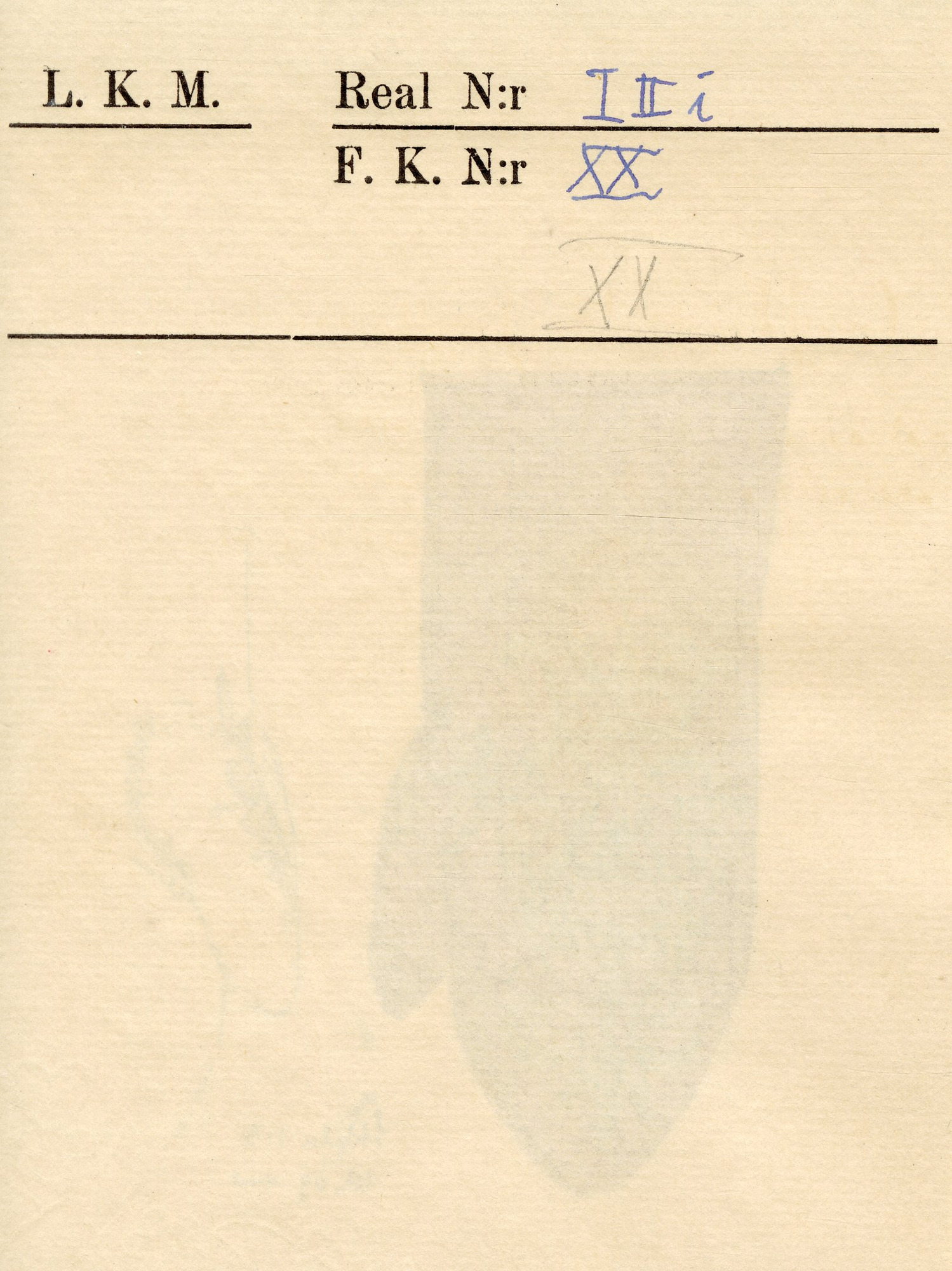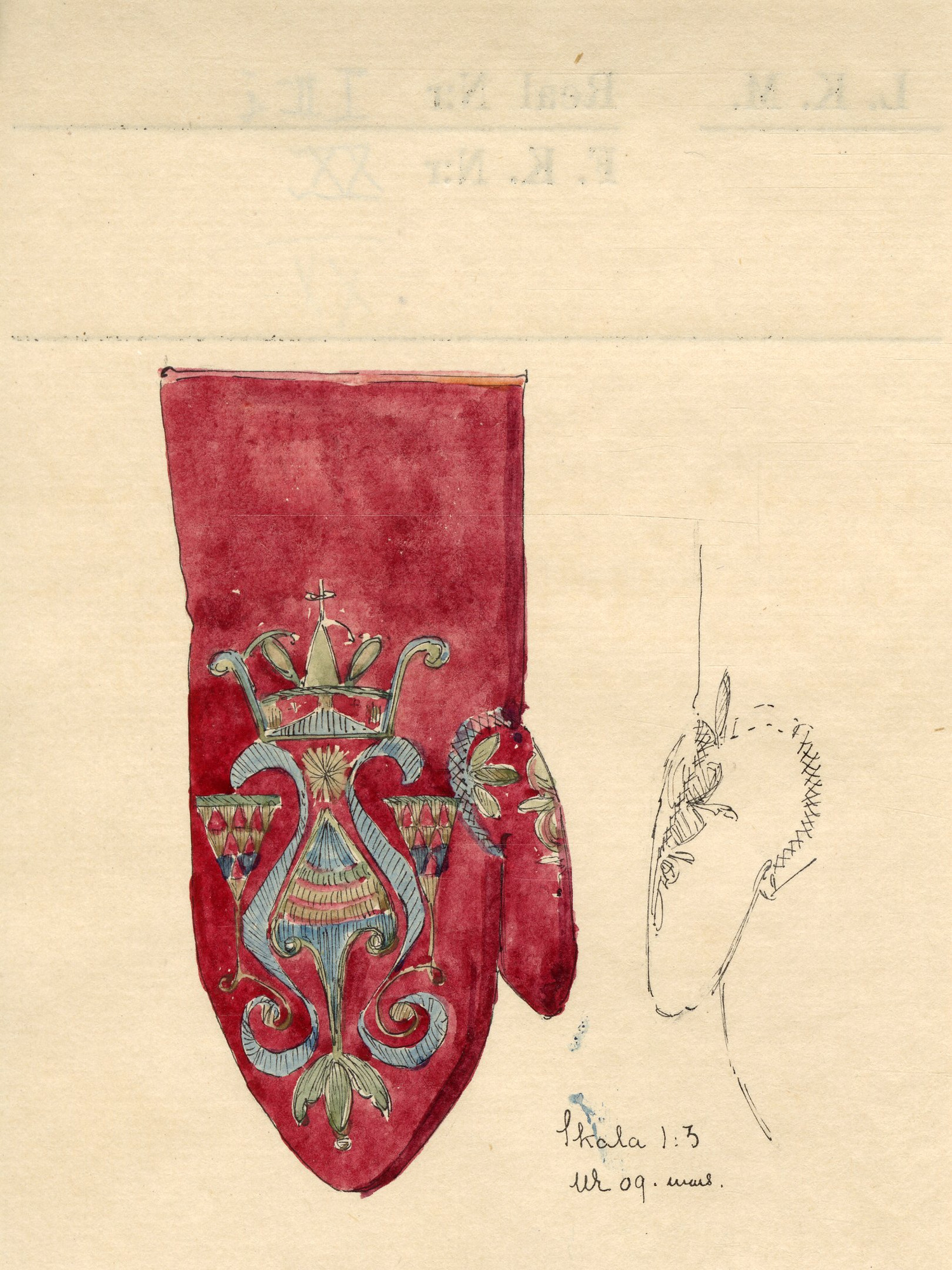Karmosinröd ylle, skinnfodrad, med pälsen inåt. Polykromt silkebroderi i gråblått gult, grönt och vitt. Även tummen är broderad. Små hål.