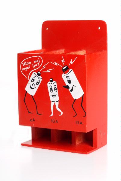 - Med tre fack för 6A, 10A och 15A säkring. Säkringarna läggs i uppifrån och kan tas ut en och en längst ner. Rödmålad; framtill tre säkringar med ben och ansikte målade i vitt och svart och texten "utan mej inget ljus".
