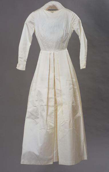 Vit brudklänning i kypertvävt syntettyg. Liv fram, avtaget mot midja, bystinsnitt från sidan, midjeinsnitt. Liv bak, midjeinsnitt och blixtlås mitt bak. Livet fodrat med tunn tuskaftvävd bomull. Långa snäva ärmar som knäpps med 5 klädda knappar, rörelseveck vid armbågen. Kjol i 4 våder, veckad mot livet i stora motveck. Kjolen fodrad med ett styvt non-wovematerial. Längd från axel: 148 cm. Längd kjollen mitt fram från livet mätt: 107 cm. Fållen fläckig samt någon fläck även högre upp på kjolen. Bak är kjolen rynkad mot livet.