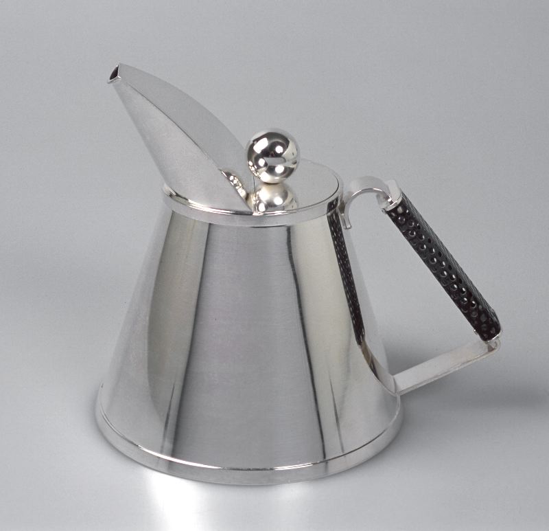 - Grundformen är en upptill avbruten vid kon. Pipen utgår direkt från mynningen i hela dess bredd, svagt vinklad utåt och mjukt rundad. Handtag av perforerad svartbränd stålplåt. Plant halvcirkelformat lock med klotrund knopp.
