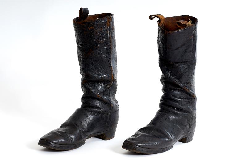 Svart läder, framdelen av skaftet och ovanlädret i ett stycke; sidsöm; sulade med träpligg, hästskoformade järnbeslag på klacken; två stroppar.