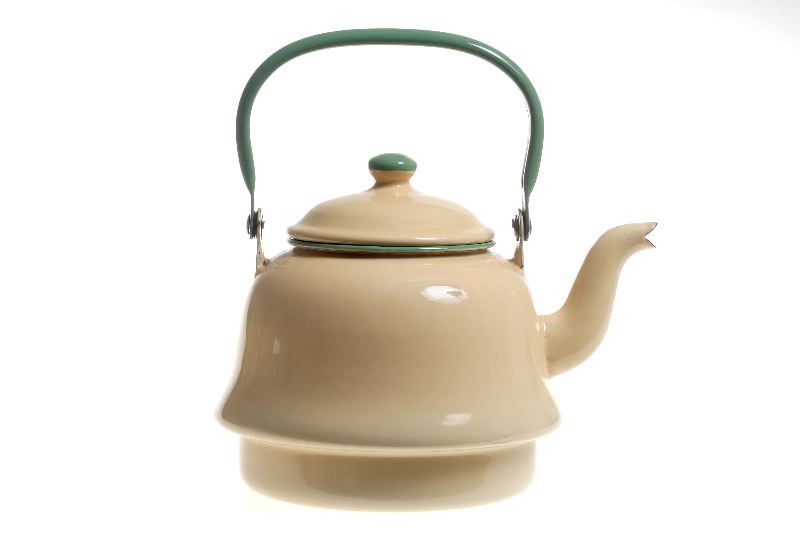 Rund med lock; närmast klockformad, passar i järnspis med ringar; våggrepe; gul med gröna detaljer.