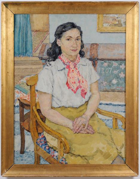 Porträtt av hustrun Klara Molin-Nilsson sedd sittande snett framifrån. I bakgrunden ses en allmogekista och Eric O Nilssons självporträtt (båda i Kulturens ägo).