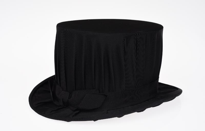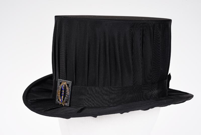 - Cylinderhatt klädd med veckad svart sidenrips. Ripsband runt kullen med metallmärke mitt fram. Gulvitt sidenfoder med tryckt firmamärke. Ljusbrun svettrem med initialerna DJ instansat. Tillhörande papperskartong L 33,5 cm, Br 28 cm, H 15 cm..