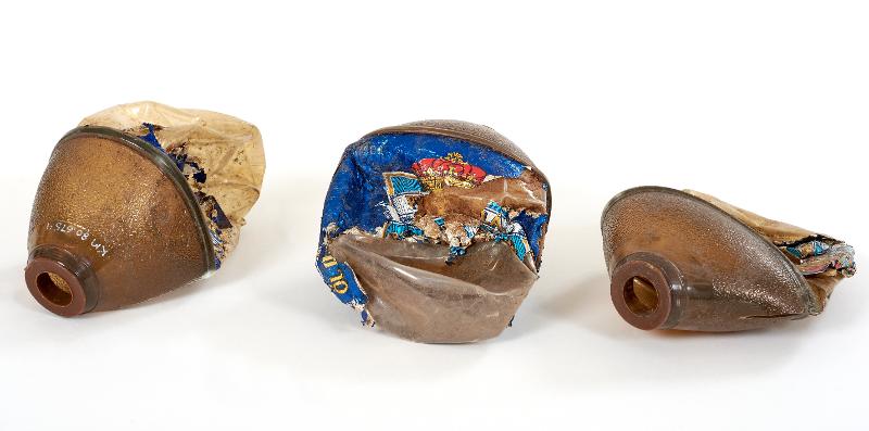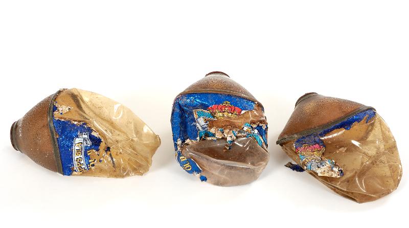Fyndet består bland annat av tre stycken tillplattade rigelloflaskor med metallfolieetikett för Pripps Blå.
