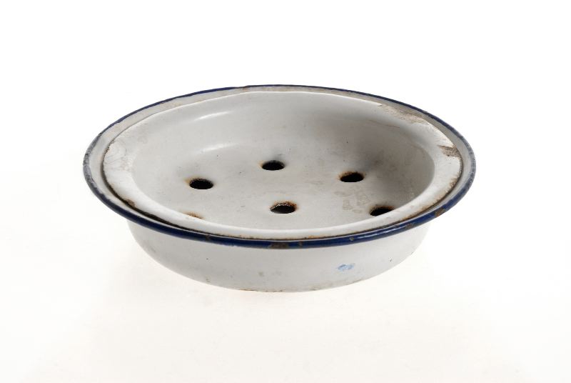 Rund, består av en yttre och en inre skål, som båda är vita. Den inre har åtta avrinnings hål i botten. Den ligger löst ovanpå den andra skålen, som har blå ytter kant.