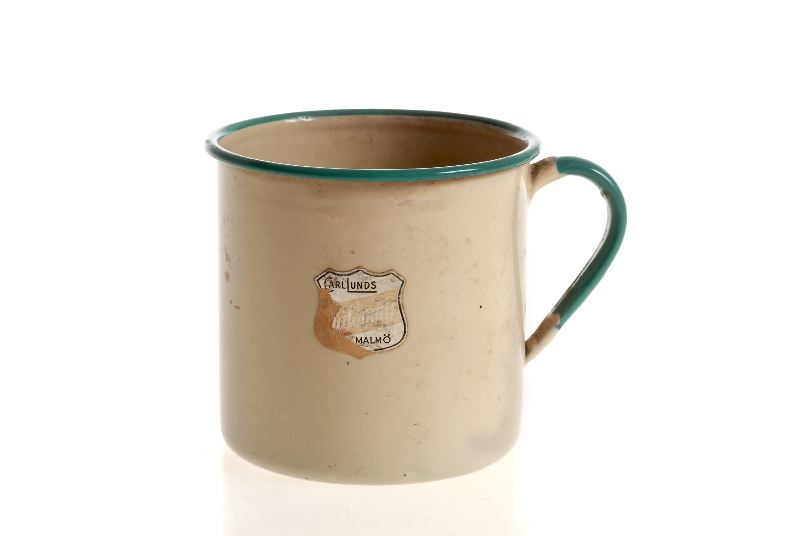 Form av en sköld, upptill står det: CARL LUNDS; diagonalt: ålemalj, samt där nere står det: MALMÖ.