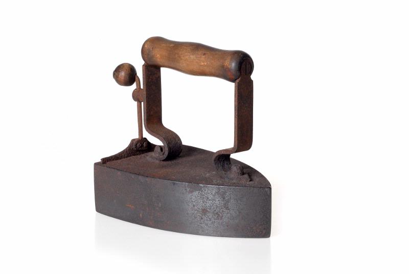- Handtag; två nedtill kraftigt insvängda järnband, håller trähandtag (L 12 cm) med två inbuktningar. Banden nedtill spetsiga och fastskruvade. Lucka. Handtag av träkula fäst på stående järnpinne (H 6,5 cm). Innehåller lod (L 13 B 7 cm).