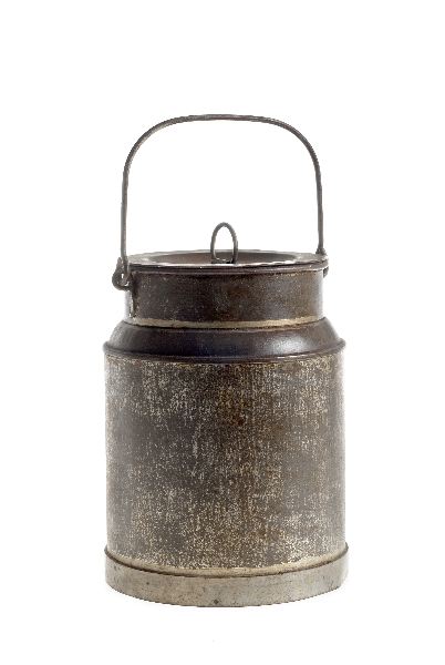 Cylindrisk avsmalnande uppåt med rörliga grepe av ståltråd och ett delvis nersänkt lock med fläns och ögla som handtag.