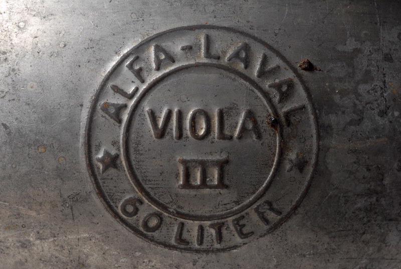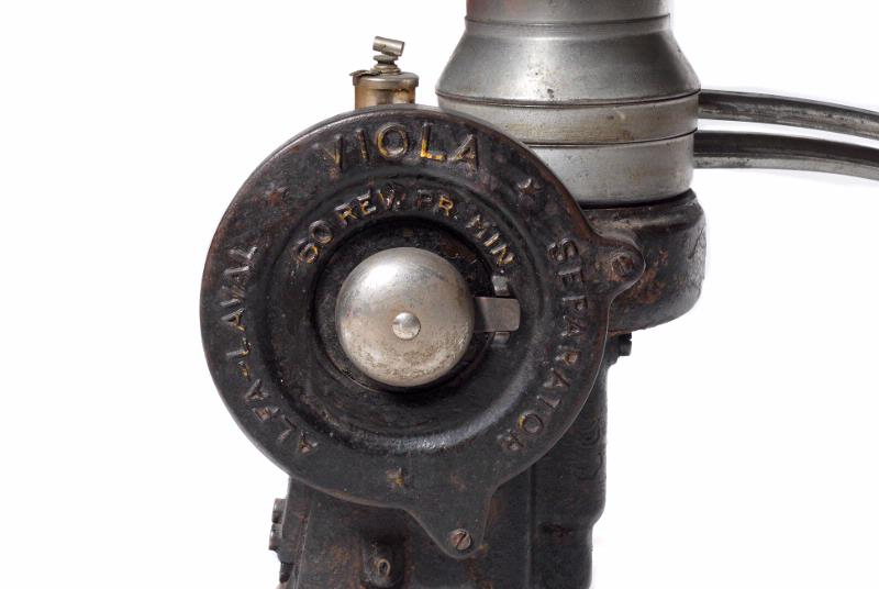 Handdriven med vev; längst upp en rund skål av pressad plåt, nedanför två avrinningshål, via ett kugghjul drivs den s k kulan som är delvis konisk och roterar horisontellt; cylindrisk glasbehållare för smörjolja; de övre delarna är förtenta, nederdelan svartlackerad med guldornament; på vevaxeln sitter en ringklocka.
