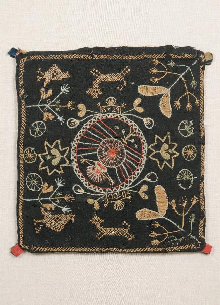 Ovansidan broderad med stiliserade blommor, sjur, fåglar m.m. Fodret; munkabälte och rips. Mönsterinslag och botten i nöthår, linnevarp. Ränder i munkabälte med rakställda stjärnor och kvadrater, tvistränder emellan. Mönster i mörkbrunt, brunt, ljusbrunt, gult och rosa. Broderi med ullgarn i stjälkstygn, korsstygn, häxsöm i rött, grönt, blått och vitt, färgerna mycket blekta på rätsidan. Hörntofsar av lappar i olika yllekvaliteter. Mot baksidans insida är en rya fastsydd. Linvarp med inslag av ull. Avslutningar i båda ändar en kant av oblekt lingarn. Mest blå och svarta vadmalstyger i olika nyanser och grovlekar. Trasorna har lagts in skälet i remsor och dragits upp i öglor med olika mellanrum. Kortare trasor har lagts in som i skarvtjäll.