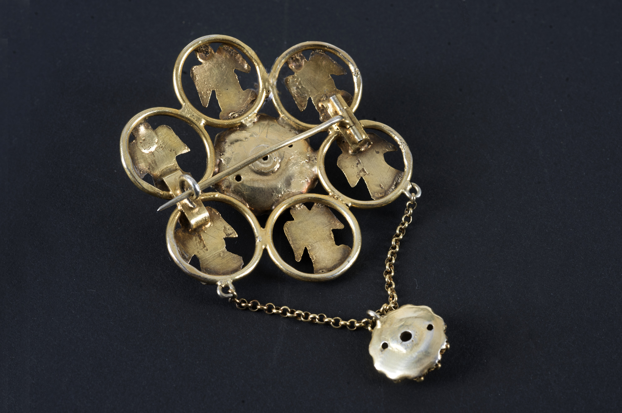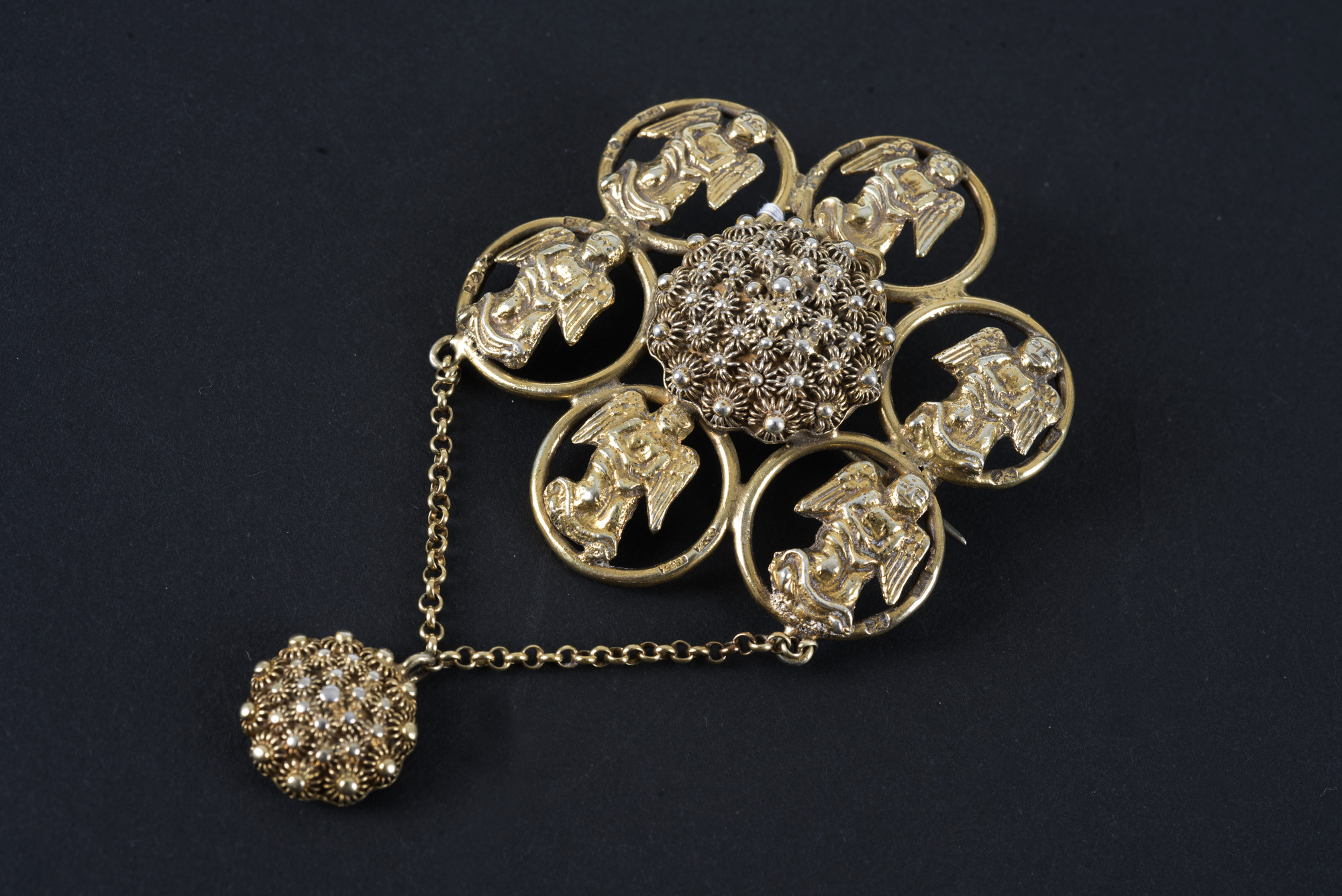 Gjord av 6 st änglamaljor, kring en filigran stolpknapp med borttagen fot, i en kedja hänger en mindre filigranknapp med bortagen fot och ögla.