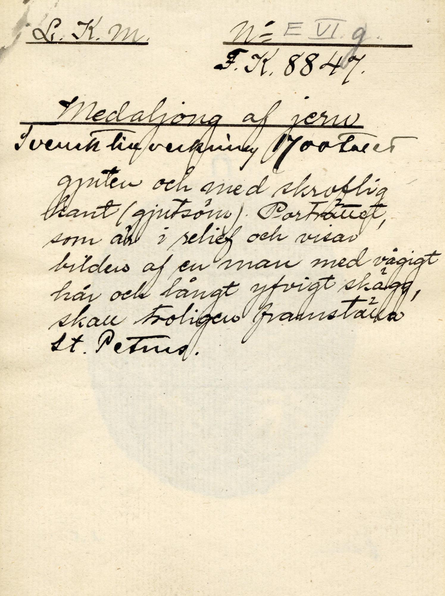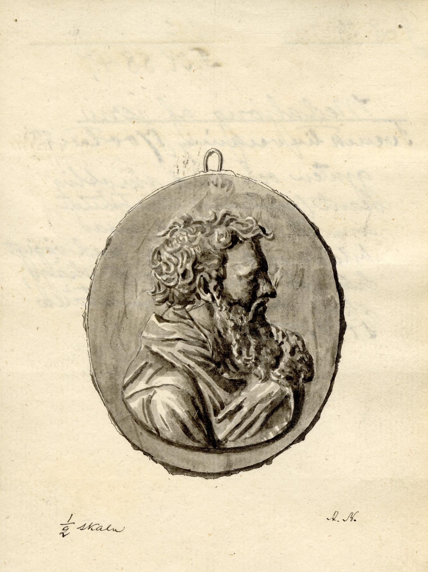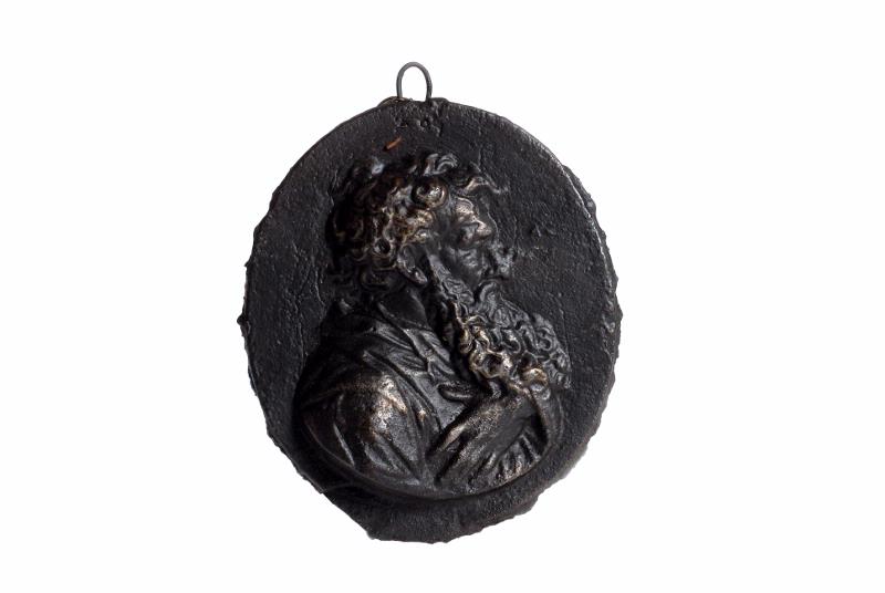 En skäggig man, föreställande aposteln Petrus. Identisk med medaljonger gjutna vid Finsbongs bruk och bygger på förlagor som modellerats av Leonard Posch i Berlin omkring 1820.