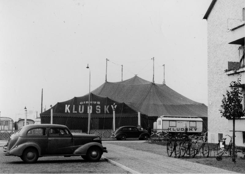 Fotografi, svartvitt; cirkus Kludsky på marknadsplatsen i Lund; cirkustält, två bilar, cyklar och till höger ett bostadshus. Fotograf Kurt Hagblom.