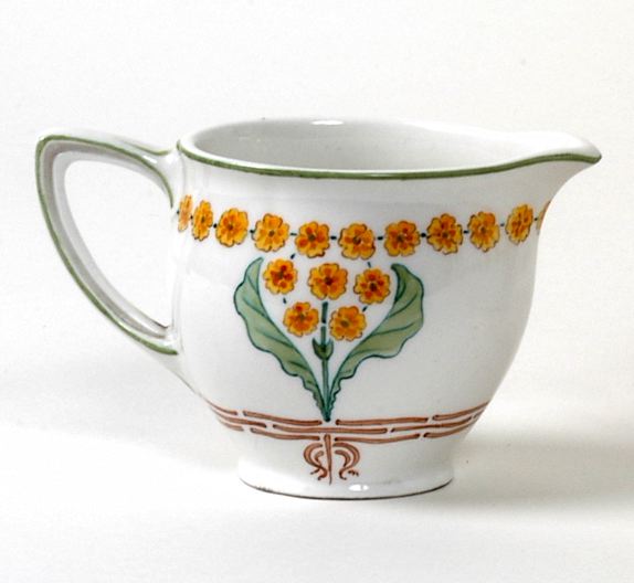 Med öra och pip; målad dekor i gult, grönt och brunt; mönster av gullviva och gullvivsblad.