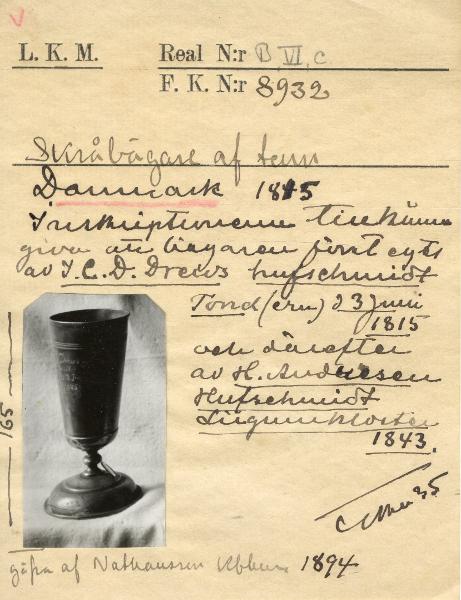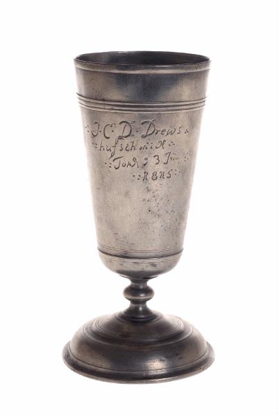 Bred, kupig fot, litet knappben, svagt utåt vidgande kuppa. Inskriptioner på sidorna I C D Drewshufschmidt Tord 23 Juni 1815 - H Andresen Hufschmidt Lügumkloste 1843.