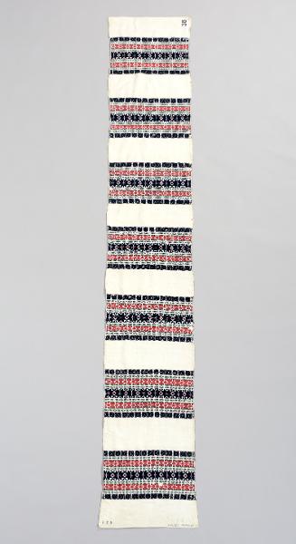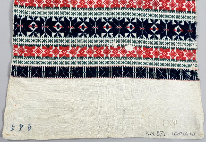 Vit botten. Mönsterbårder i rött, blåsvart, grönt. Märkt BPD i gröna korsstygn.
