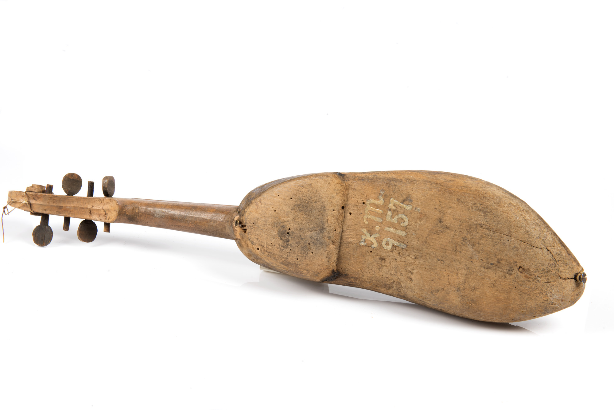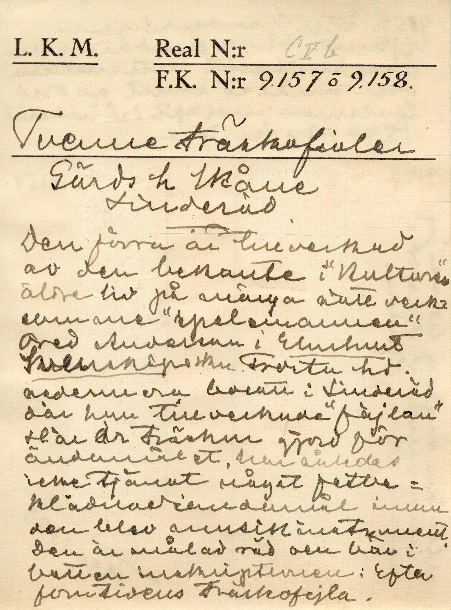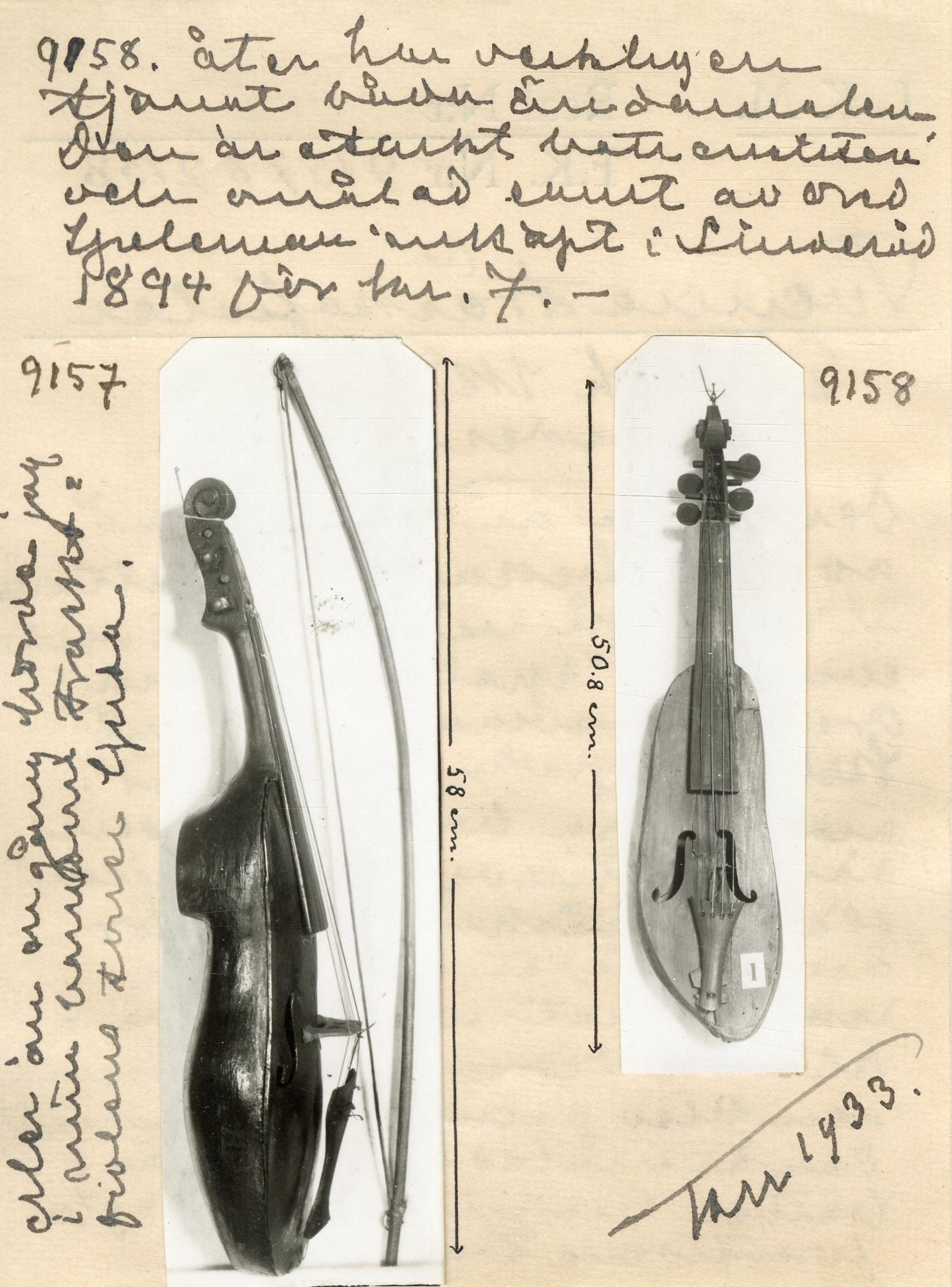 Den förra är tillverkad av den bekante i Kulturens äldre tid på många sätt verksamme spelemannen Ored Andersson i Elmhult Svensköps skn Frosta hd sedermera bosatt i Linderöd där han tillverkade "föjlan". Här är träskon gjord för ändamålet, har således icke tjänat något fotbeklädnadsändamål innan den blev musikinstrument. Den är målad röd och har i botten inskriptionen: Efter forntidens träskofejla. 9158 har verkligen tjänat båda ändamålen. Den är starkt [?] och omålad samt av Ored Speleman inköpt i Linderöd 1894 för kr 7